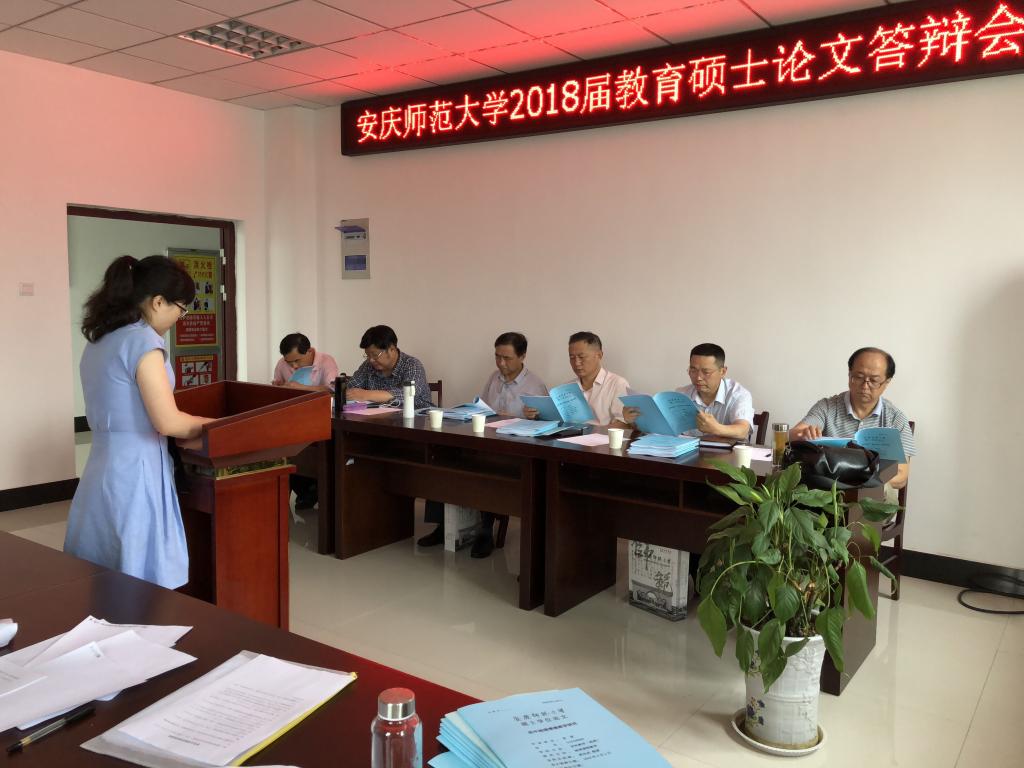 举行。教育硕士专业学位点特邀安徽师范大学吴玲教授和合肥学院伍德琴教授担任本次答辩委员会主席,邀请安庆市教育教学研究室中学高级教师何成法和安徽省怀宁县小市初级中学的高级教师夏显亮担任答辩委员,硕士点导师曹长德教授、张理华教授、徐汪华教授、高向东教授、张祥稳教授、郭启华教授、宋志英教授、荀安华副教授、张启树副教授作为答辩委员会成员,小学教育、学前教育、学科教学(历史)、学科教学(数学)、学科教学(化学)、学科教学(地理)、学科教学(物理)、学科教学(音乐)的20名研究生参加答辩,部分2017级在读研究生旁听了本次答辩会。