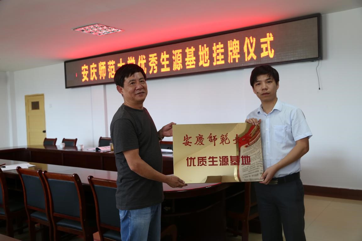 招生宣传过程中,汪洋副院长代表安庆师范大学与黄山市第一中学签订了“优秀生源基地合作协议书”,并举行了授牌仪式。