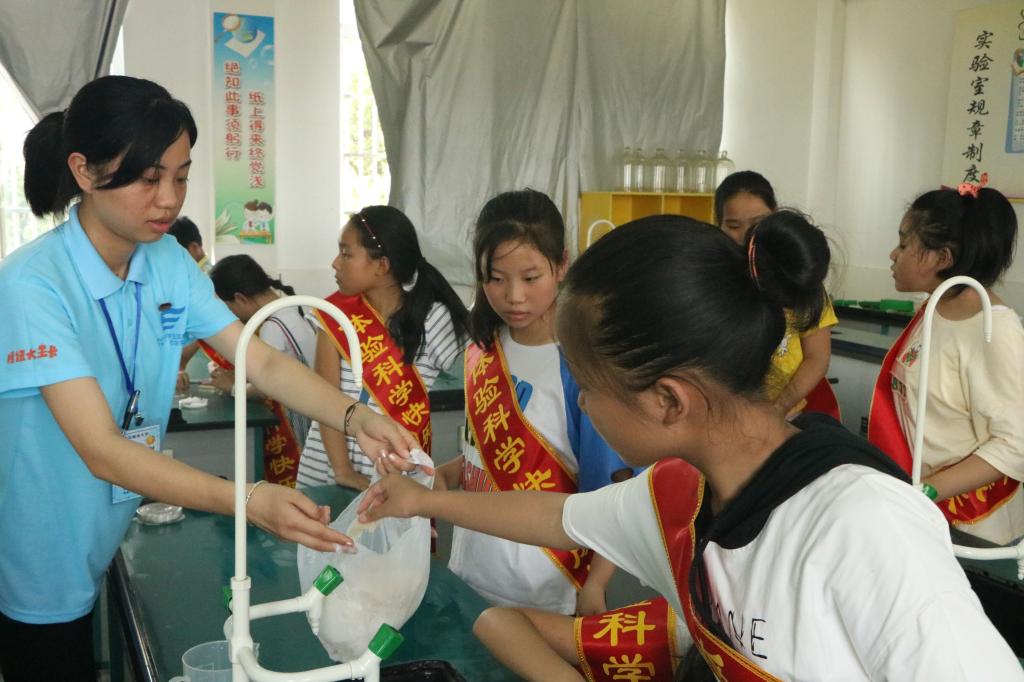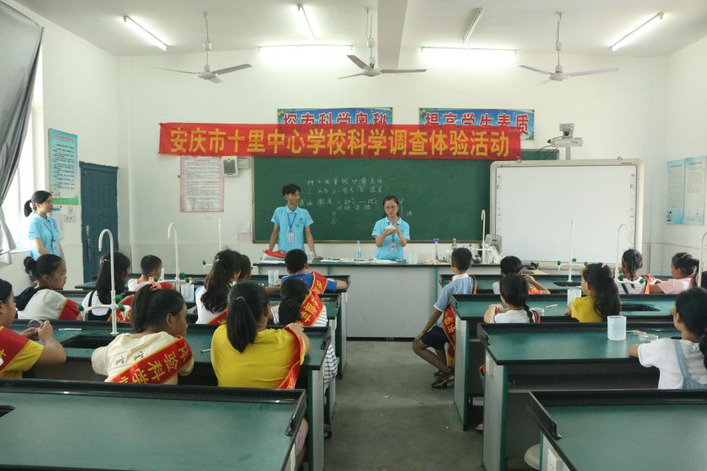 “心手相牵 阳光童行”实践服务团的志愿者们来到安庆市大观区十里中心学校,给该校百名困境儿童科普了各种知识,并教会了他们如何做“人工湿地”科学实验。