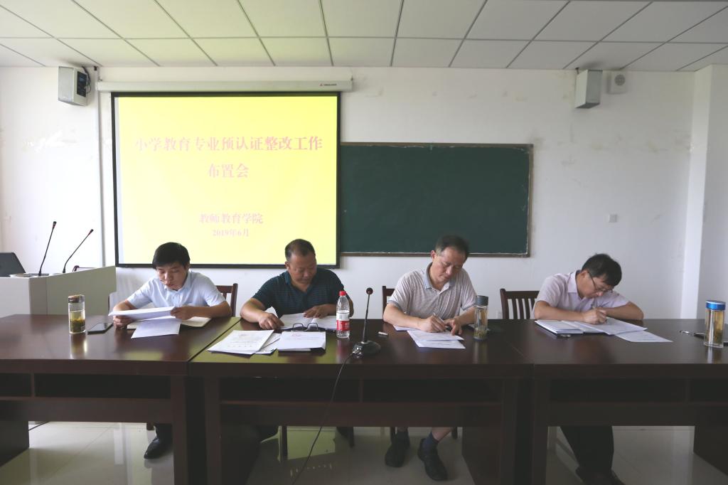 召开小学教育专业预认证整改工作部署会。学院党委书记曹长德、院长吴云助、副书记许世平、副院长汪洋出席会议,小学教育专业全体教师、学院行政科室相关人员及辅导员参加了会议。会议由曹长德主持。
