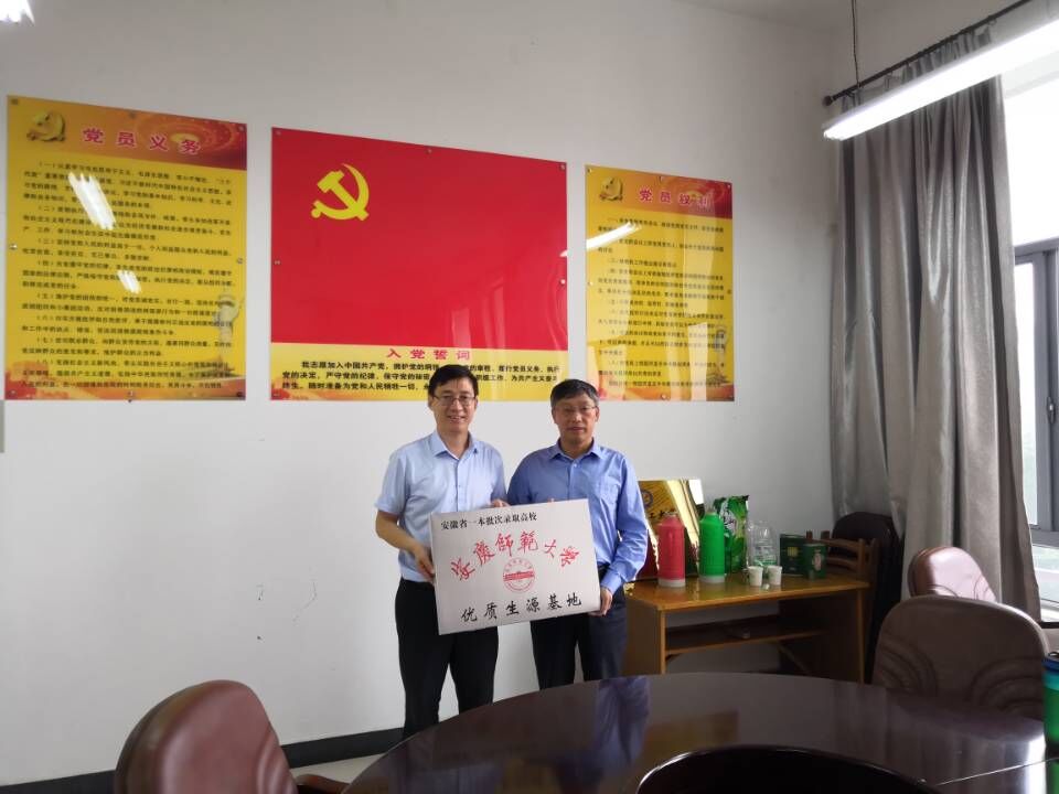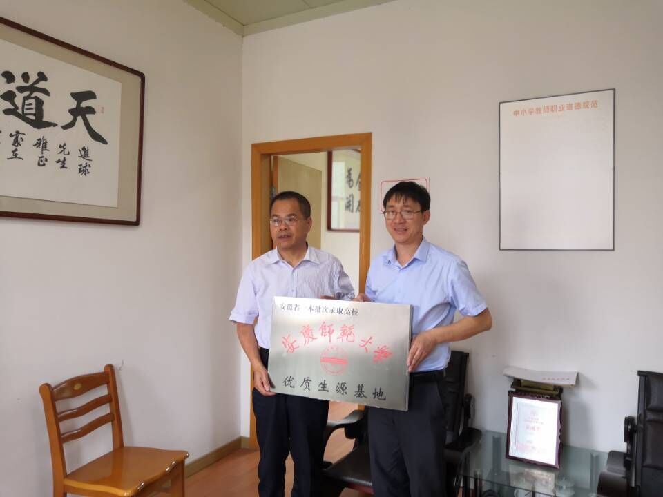 国家定向培养全科型乡村小学教师的小学教育专业做了说明,欢迎学生积极报考我校。两校领导表示会把我校招生的优惠、奖励政策向高考学生、家长宣传到位。许世平还对《安庆师范大学优质生源基地合作协议书》的主要内容做了介绍,休宁中学校长李顺宝、祁门一中校长张进球在协议书上签字,许世平代表学校授予两所学校“安庆师范大学优质生源基地”牌匾。