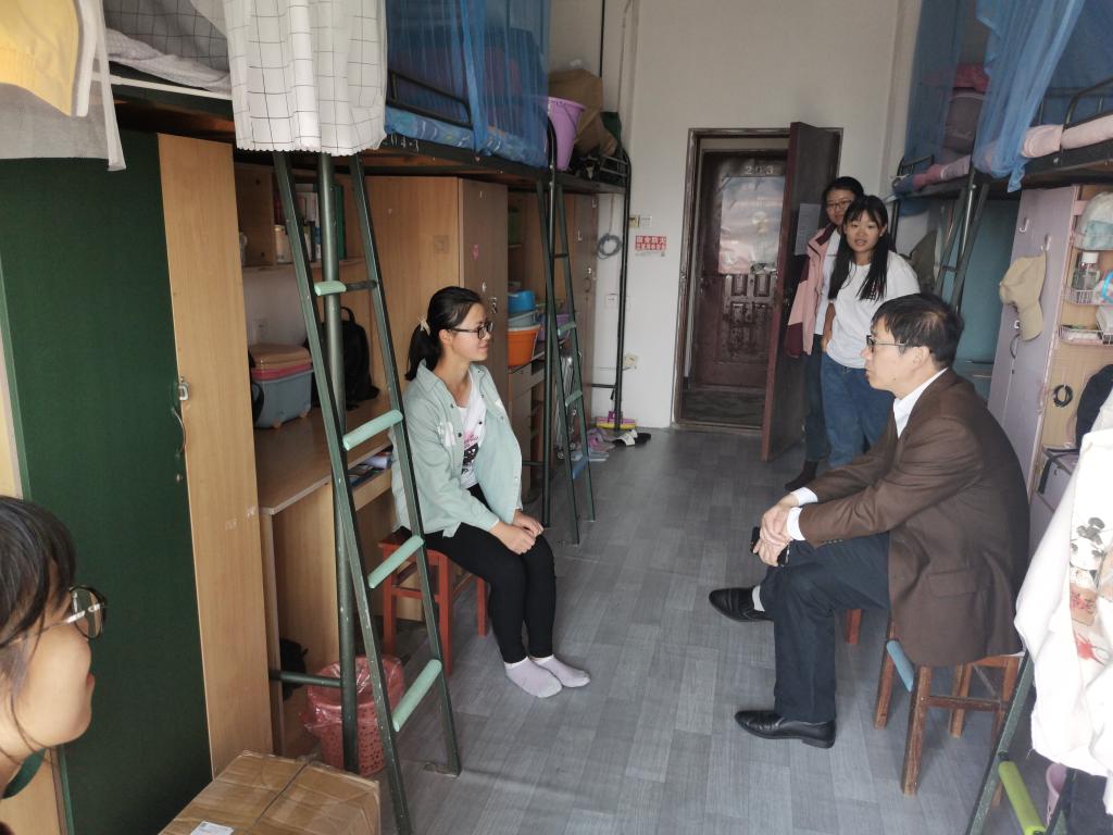 许世平一行认真查看了宿舍卫生、安全用电情况,与学生们进行了亲切交谈,详细询问学生的日常生活、专业学习等方面的状况,征询学院在学生教育管理、教育教学等方面的意见建议,亲切和蔼。