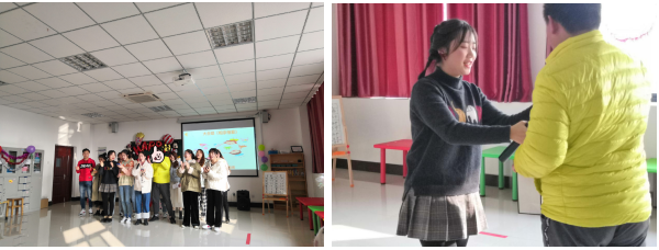 特殊教育专业每周一至周五上午及每周二至周四下午会为自闭症学生提供社会服务,由特教16、17级本科生和18、19级研究生负责给小朋友们上个训课和团课。此次新年联欢会既是“迎新年”主题系列活动的成果展示,也是对本学期社会实践的总结。自闭症学生和大学生一起主持,一起做游戏,一起唱《隐形的翅膀》,一起跳《新年乐淘淘》,一起表演情景剧《过新年》……尤其最后师生们共同带来的大合唱《相亲相爱》将联欢会的气氛推到高潮。